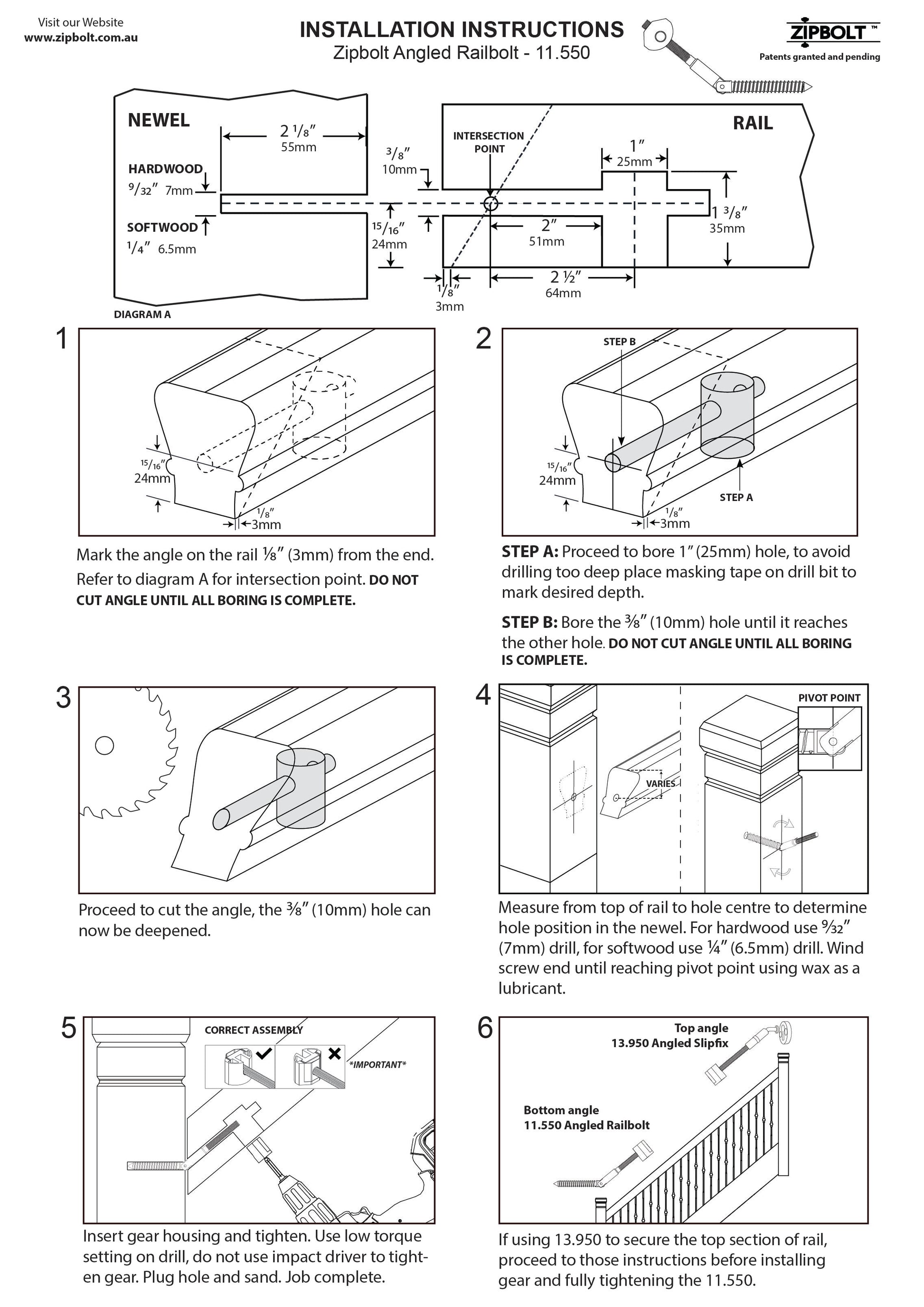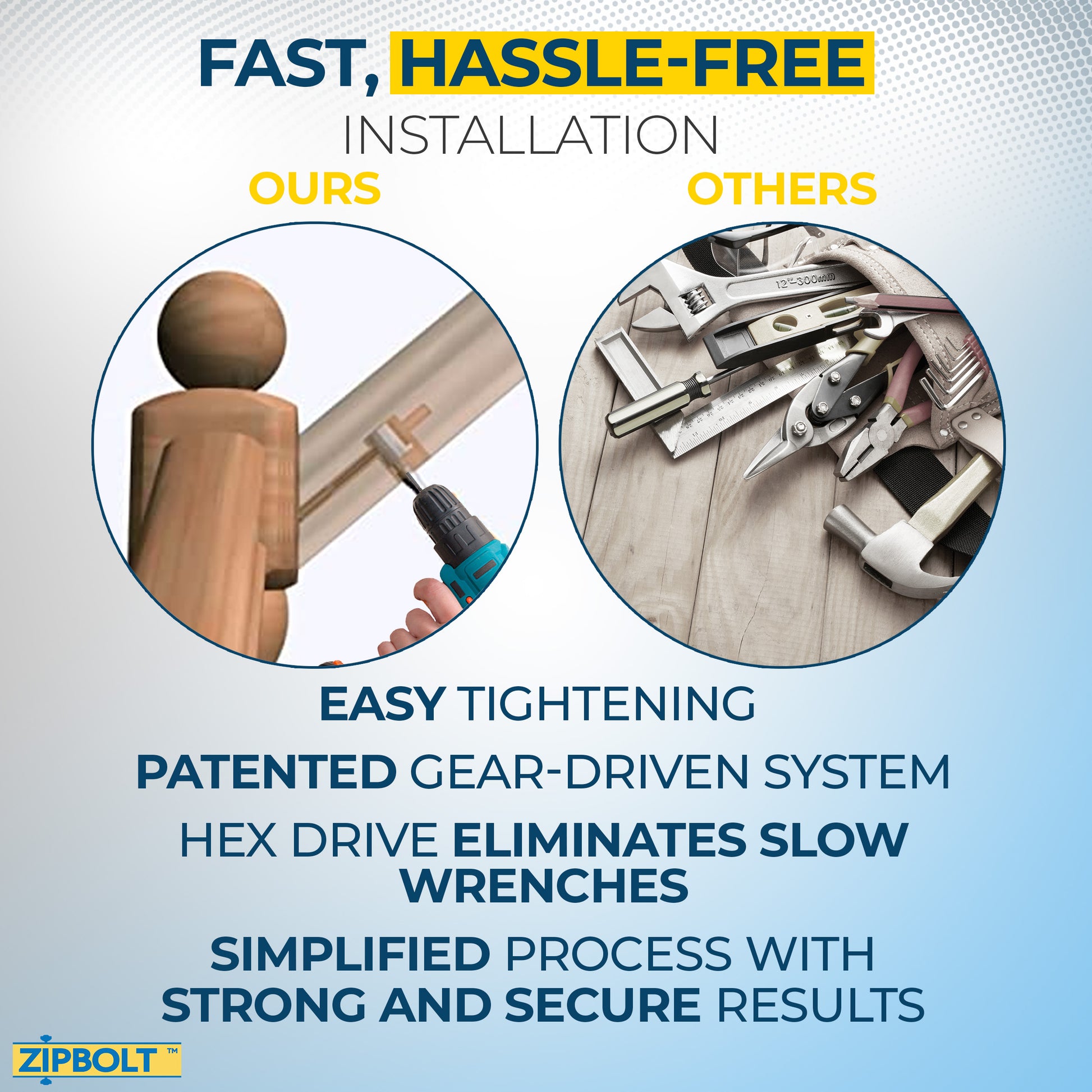 - INNOVATIVE PATENTED DESIGN – Zipbolt offers a distinctive patented gear drive that outperforms all others in terms of functionality. The innovative UT gear-driven mechanism eliminates the issues associated with conventional techniques of joining stair newels to rails. The railbolt housing's distinctive open channel allows the housing to be dropped directly on the shaft, eliminating the need for nuts and washers.